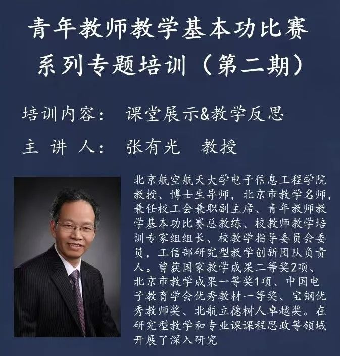 在本次培训中,张有光教授从赛前准备、教学过程、教学艺术、板书设计、教学反思等方面逐一分析了大赛中每个环节的评审标准和注意事项,以往届大赛中的选手为例,总结经验教训,为青年教师的备赛教学提供了新思路。