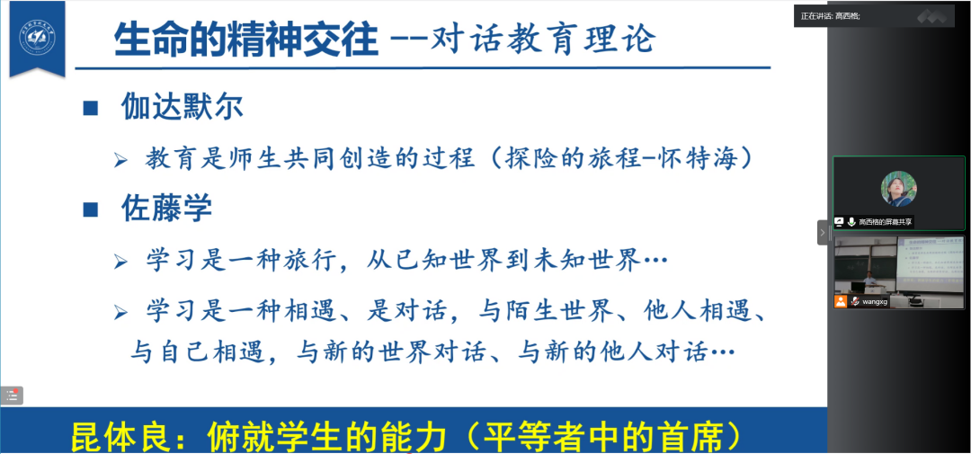 “教育是师生共同创造的过程”,教师应具备“俯就学生的能力”,张教授列举伽达默尔和昆体良的教育思想,解释了教育教学中教师如何更好引导学生、如何培养学生的思辨能力等问题。