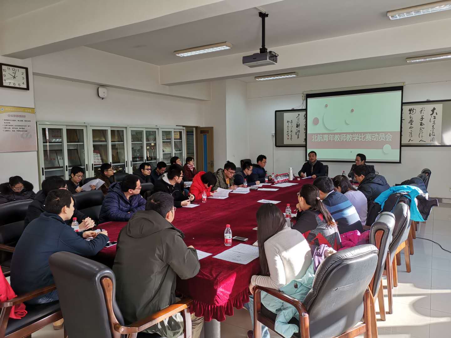 为了帮助参赛教师更好的完成赛前准备,2019年1月23日,校工会举办了北航青年教师教学比赛赛前动员会,邀请北京市青教赛历任评委熊庆旭、张有光两位老师为三十余名晋级青年教师进行了赛前动员和培训,他们结合自身多年从教经验,为青年教师传经送宝、打气助威。
