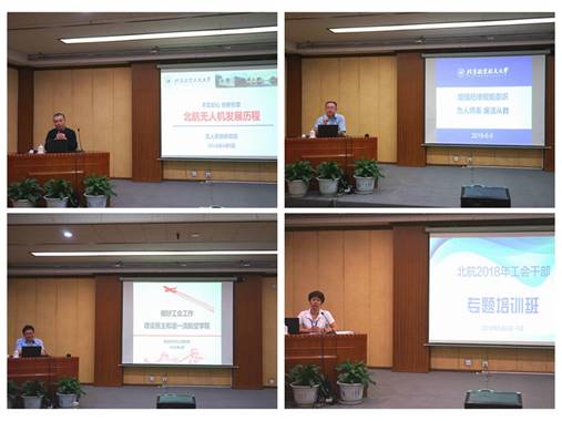 在专题讲座中,无人系统研究院院长、书记王养柱做了题为《不忘初心 创新引领 北航无人机发展历程》的专题党课,向学员们讲述了北航无人机为服务国家战略需求,从无到有,从有到优,不断开拓创新、锐意进取的发展历程和秉承空天报国、立志科技强国的无人机精神;校纪委副书记、纪委办公室主任武立勋做了题为《增强纪律规矩意识为人师表 廉洁从教》的专题报告,他介绍了学校纪检监察相关工作,并采用现实案例向各位学员们阐述了党员干部应遵守的政治纪律、组织纪律、廉洁纪律、工作生活纪律及中央八项规定精神具体内容。航空科学与工程学院书记林贵平做了题为《做好工会工作,建设民主和谐一流航空学院》的报告,从坚持党对学院工会工作的全面领导、坚持发挥学院工会的桥梁纽带作用、坚持强化学院工会的民主管理职工、坚持凝心聚力构建和谐学院等方面介绍了航空学院的建设情况,为其他单位的工会工作提供了借鉴;校工会常务副主席程文浩做了《工会财务相关工作要求》的专题辅导,向各工会干部通报了2017年工会财务审计相关情况,指出了财务工作中存在的不规范之处,并 要求二级工会在以后的财务工作中严格按照规范和标准来开展工作。