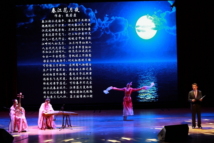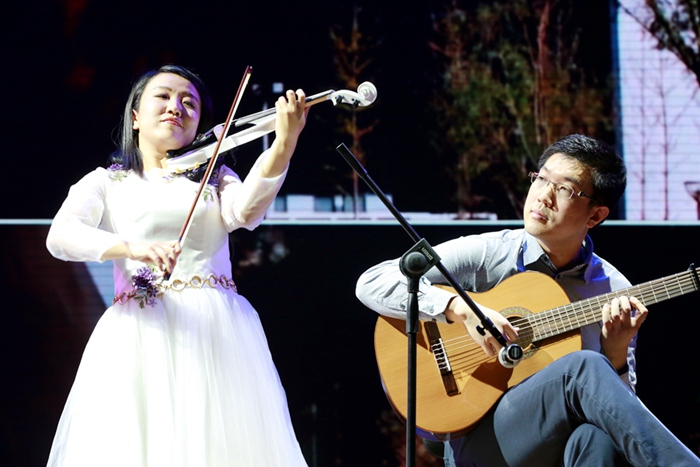 同时,校团委的张聪与大学时期的搭档周晓博演奏了小提琴、钢琴协奏曲《梁祝》,乐曲如泣如诉,张聪用指尖上的芭蕾再现了经典;古筝、琵琶二重奏《春江花月夜》邀请了机械工程及自动化学院副教授文力担任诗朗诵,为悠远的意境增添了几分诗意;档案馆的李桐邀请了四位有着共同爱好的学生组成了铜管五重奏,以神曲《小苹果》上场,并完美呈现了ragtime代表作《演绎者》,曲调诙谐,配合默契;经管学院的衣萌演唱了《匆匆那年》,校工会的温志明、机械工程及自动化学院的蒋茁用古典吉他和小提琴为其伴奏,三人忘情的表演将观众带回到属于自己青葱岁月;晚会的高潮由两位校友歌唱家的登台而掀起。98级本科生、青年美声歌唱家张冉带来一首《春天的芭蕾》,歌曲气势磅礴,展现了歌者雄厚的实力;97级本科生,我国著名青年歌唱家韩旭演唱了自己的作品《香格里拉》,声音甜美清亮,台风亲切,现场掌声雷动,很多曾经的师长和同窗都跟随着歌声追忆起往事,备受感动。