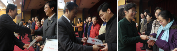 胡凌云书记、张维维副书记、纪素菊主席和部分学院领导向获得2013年教代会、工会各类奖项的单位和个人代表颁发了奖牌和证书。