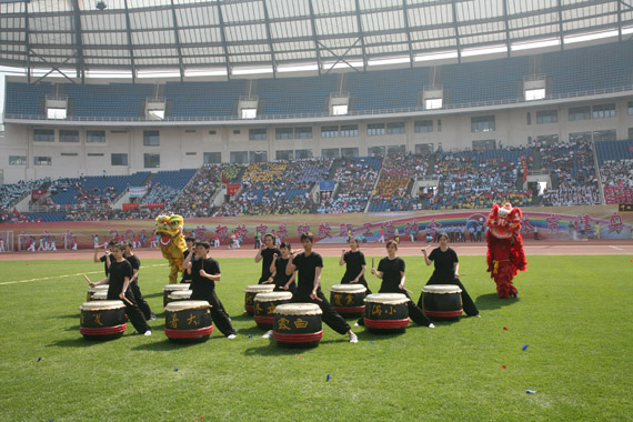 我校太极拳队伍、广播操队伍参加了本次田径趣味运动会开幕式表演,由学生鼓队、舞狮队、航模队组成的表演团体作为开幕式上九个展演方阵之一参加了展演。