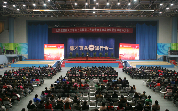 3月16日下午,我校在体育馆召开第七届教职工代表大会第六次会议暨全体教师大会。党委书记胡凌云,校长怀进鹏,常务副校长徐惠彬,纪委书记、工会主席纪素菊出席大会,第七届教代会主席团成员、全体代表,全体教师参加会议。