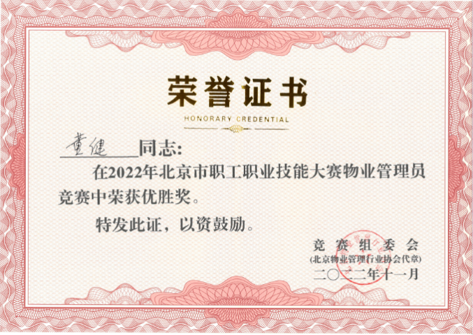 中湾智地积极响应北京物协号召,组织67名管理人员报名参加比赛。2022年11月24日初赛,中湾智地12名员工从738名选手中脱颖而出获得进入复赛的资格;11月27日复赛,4名因为防疫工作原因未能参加比赛,中湾智地档案馆项目工程经理董健进入半决赛,并最终获得“2022年北京市职工职业技能大赛物业管理员竞赛优胜奖”,同时中湾智地也荣获由北京物业管理行业协会和北京市物业行业工会联合会颁发的“先进单位”奖牌。