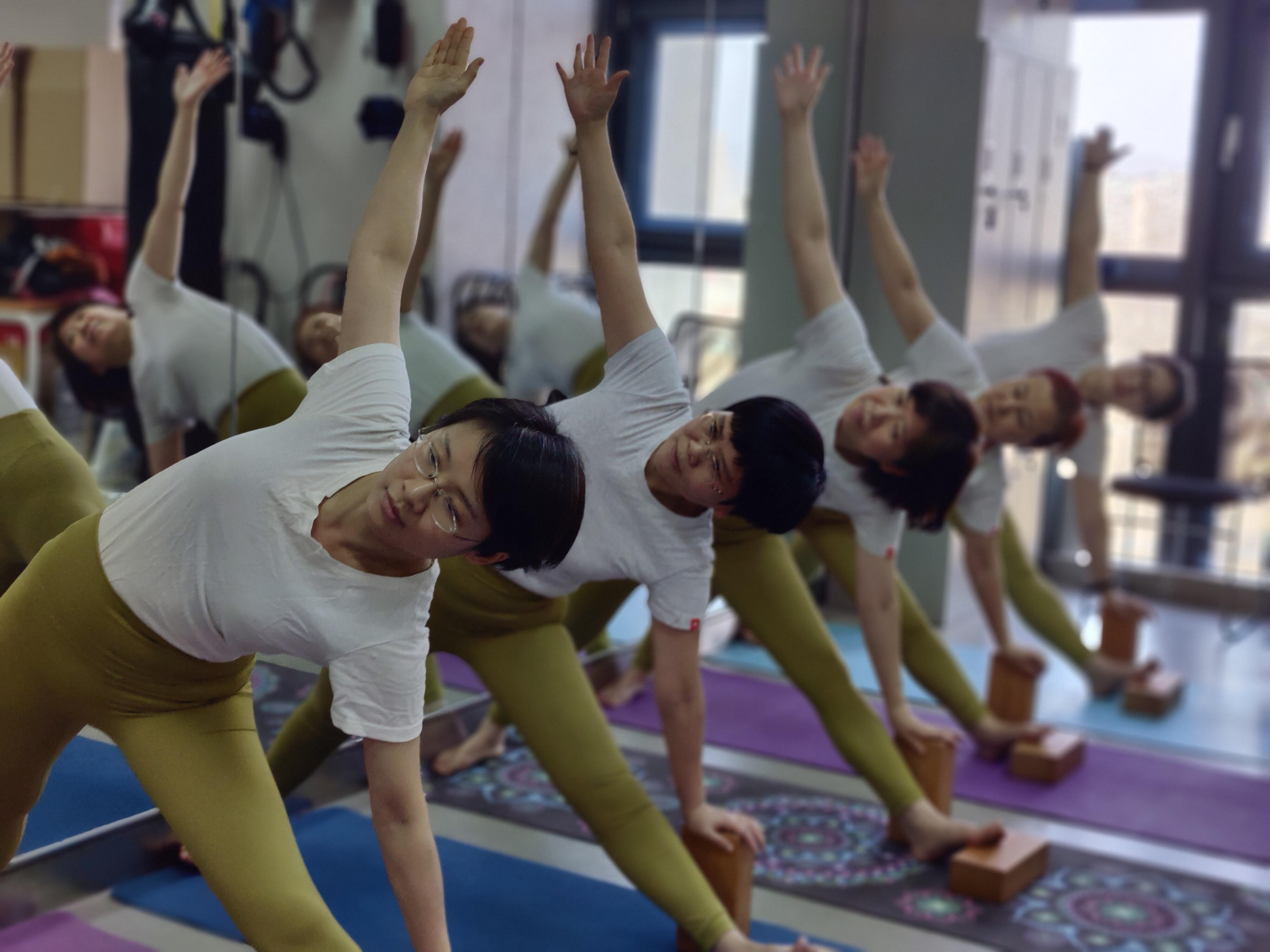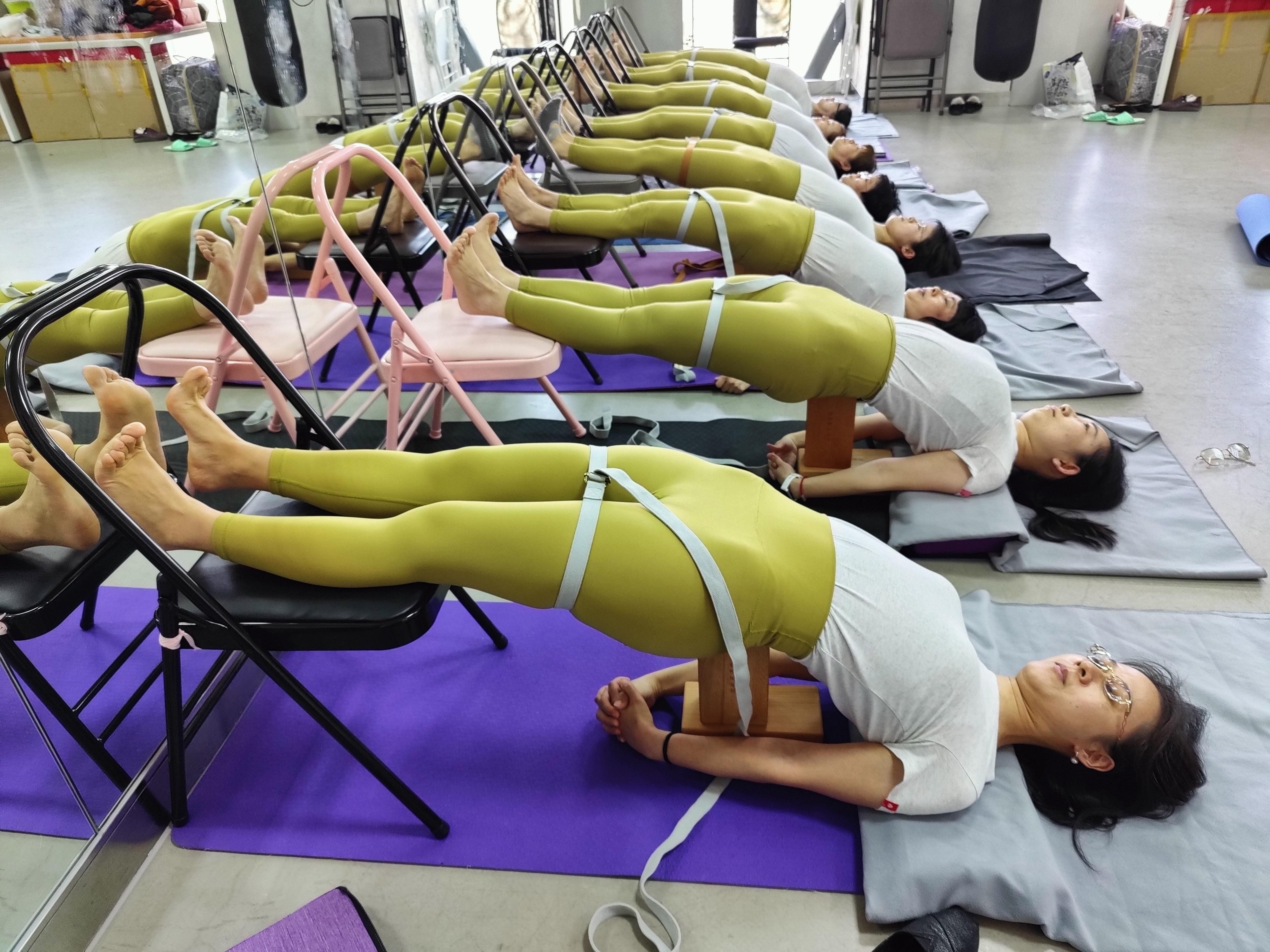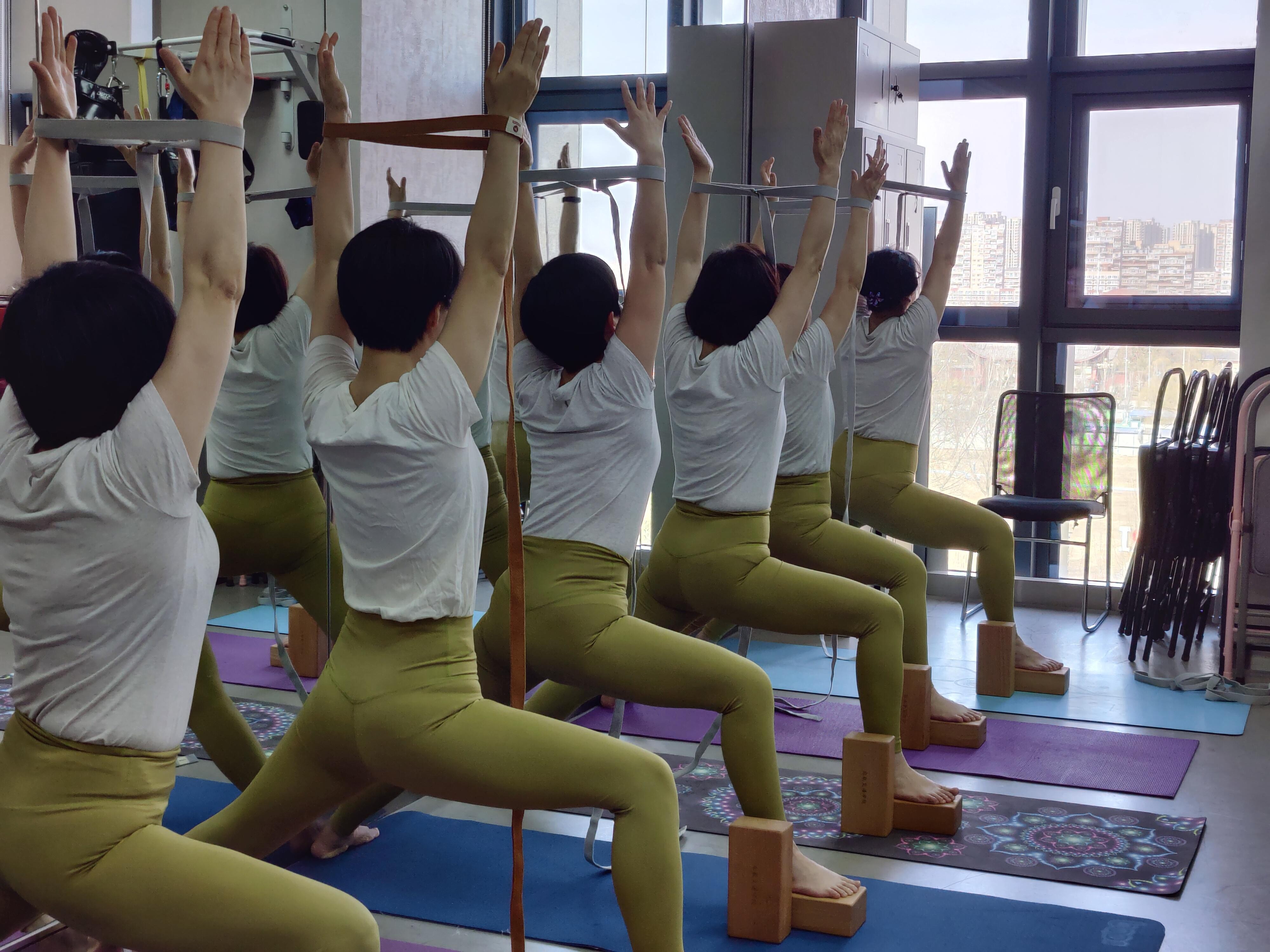 在瑜伽馆专业教练的指令下,老师们从双腿盘坐、静心冥想开始,通过精准的体位控制,利用艾扬戈理疗瑜伽对身体进行修复,净化了心灵,放松了肩颈,舒缓了疲劳的身体。