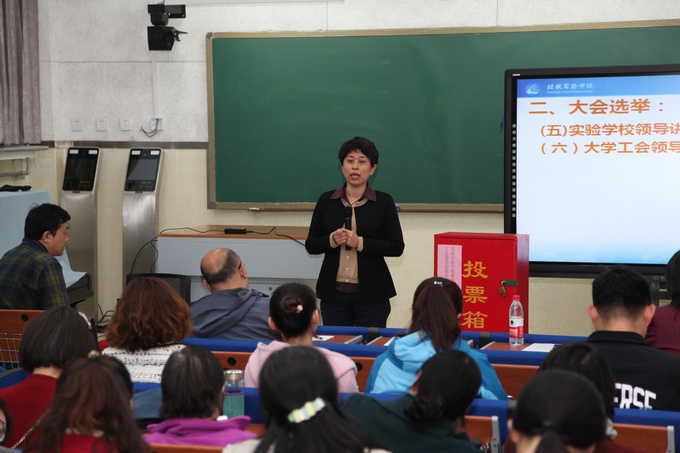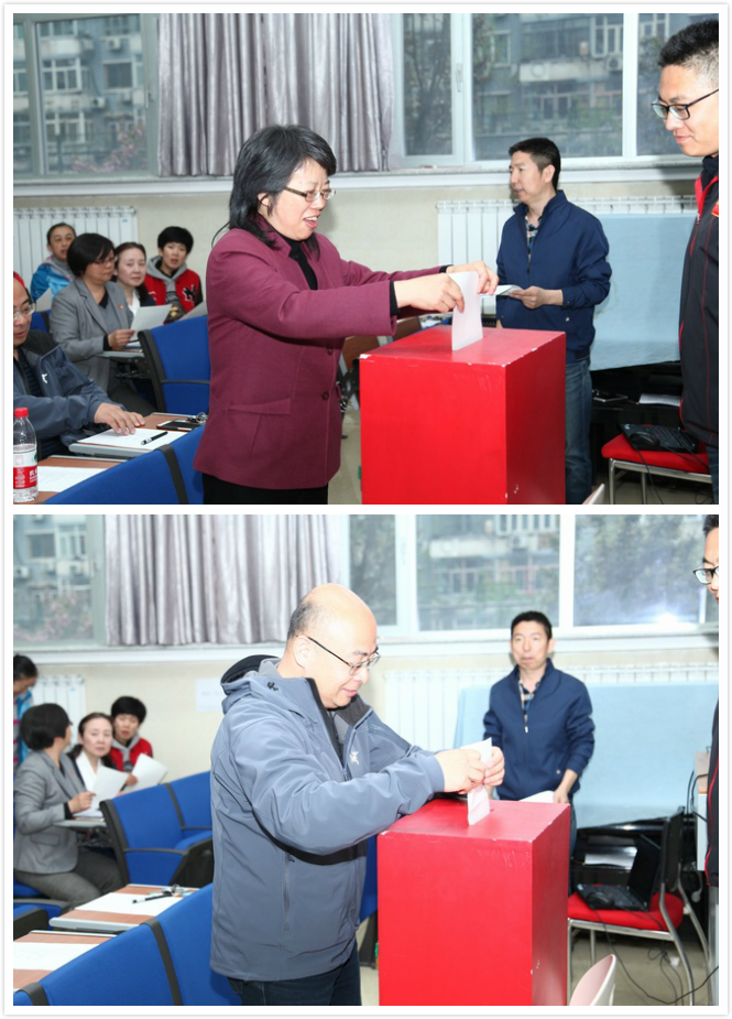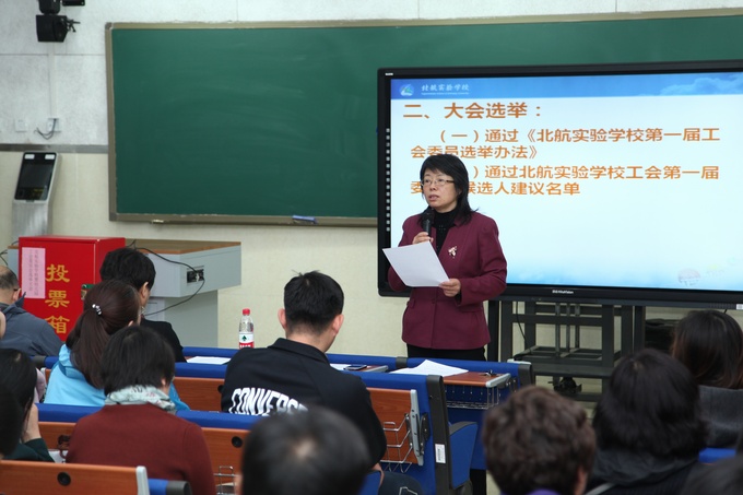 与会代表先后审议通过了《北航实验学校工会委员选举办法》、北航实验学校工会第一届候选人建议名单、选举工作人员名单。在总监票人、监票人、计票人的组织下,代表们采取无记名投票方式,选举产生了新一届工会委员会委员11名。