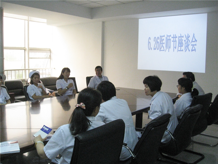 为庆祝6.26医师节的到来,激发全院医务工作者积极投身医疗事业及医院建设的热情,2015年6月26日下午,我院举办了以“医患同心 关爱医师”为主题的医师节座谈会,党总支书记李成智、副院长曹丽娟、工会主席刘岩、各工会小组长及部分科室代表参加了本次座谈会。