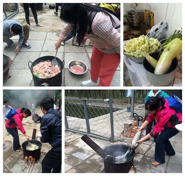比赛现场,老师们齐心协力、分工有序,洗菜、洗锅、生火、切菜、炒菜,定位明确、动作敏捷,每队都选派人手做出了自己最拿手的特色菜。面对烧柴火的大铁锅,参赛人员热情高涨,虽然铁锅菜量是平时家常量的好几倍,但老师们还是超常发挥,铁锅大炖鱼、炖柴鸡以及排骨等大锅菜都受到了一致好评。在比赛前,我们还专门在附近农场采摘了需要的蔬菜,简单的黄瓜被摆出了大饭店的造型,让人不忍心动筷子。还有好多老师自带的菜及主食,主要是蛋糕、寿司、饼干等,都不禁让我们感叹航空学院真是卧虎藏龙,连做饭都是高手如云。