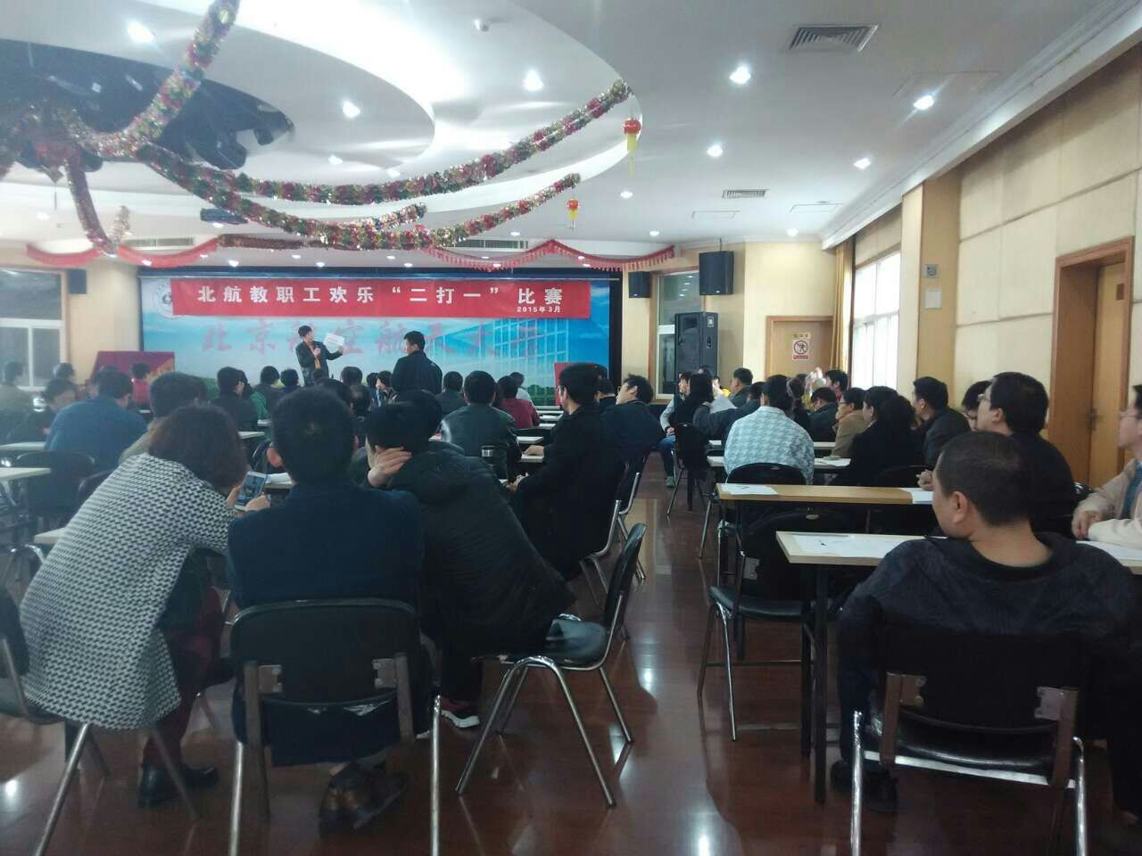 3月28日,由校工会举办的2015年北航教职工扑克牌比赛在思源楼举行。此次比赛吸引了来自各学院、机关、后勤及资产公司的近100名教职工参加,比赛冠军直接参加北京电视台体育频道《欢乐二打一》栏目比赛。