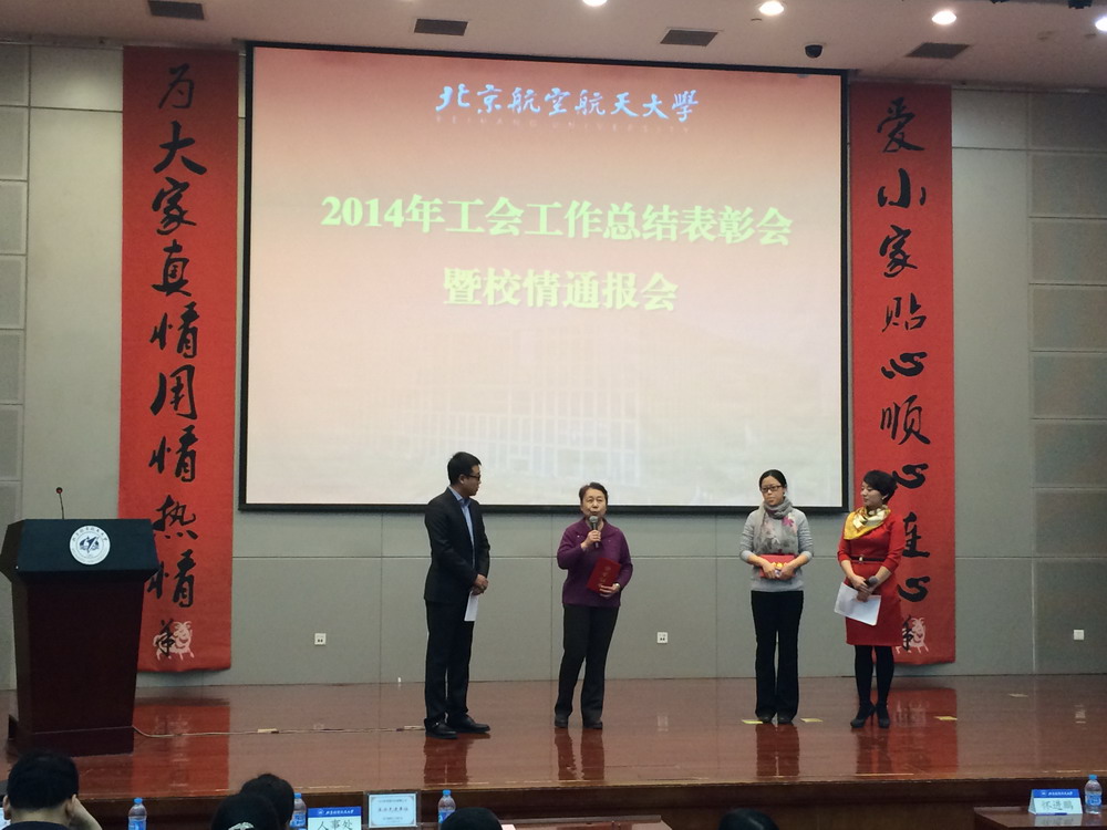 1月23日下午,我校2014年工会总结表彰会暨校情通报会在新主楼会议中心召开,机械学院党委书记邓怡、学院工会常务副主席梁永建、工会委员代表、教师代表参加了会议,机械学院原党委书记秦蓉老师、机械学院工会现任组织委员赵晓慈老师分别代表老一代工会工作者和青年工会工作者发言,秦老师谈到自己多年来的感触,指出工会是爱心的桥梁,是党联系群众的纽带,广大工会干部不断奉献着爱心,是和谐校园建设中靓丽的风景线。赵晓慈老师认为工会干部大多是一线教师,对待工会工作不仅要负起责任,更要有“心”和有“情”,工会工作就是润物细无声般付出爱心,于细小处见真情,精彩的发言引起了与会北航工会工作者的共鸣。