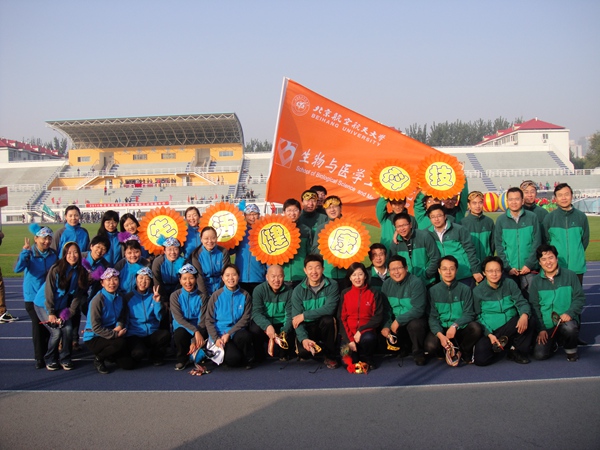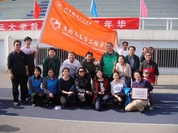 2014年北航教职工嘉年华圆满落下帷幕,生物与医学工程学院显示出朝气蓬勃、团结进取,自信坚定,永争一流的良好风尚,倡导“科技”保障“健康”, “健康”成就“生活”,翻飞的彩虹舞带,舞动出炫彩与活力。在学院老师的努力下,学院的入场式新颖别致,运动员老师们在赛场上全力超越,参与服务的老师尽心尽力,所有人的倾力付出换来了可喜成果。最终取得了团体总分第六和优秀组织奖的优秀成绩。