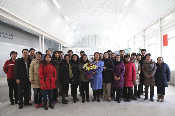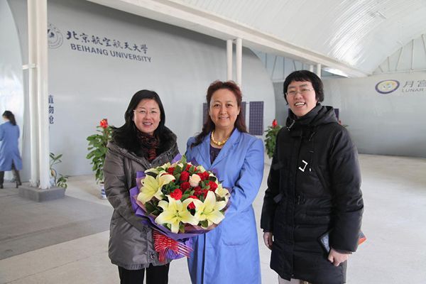 韩慧瑜书记代表学院向刘红教授“月宫一号”科研团队送上了慰问的鲜花,并通过视频系统对实验舱里的女教师和学生们致以节日的问候,祝愿他们顺利完成预定任务,保重身体。