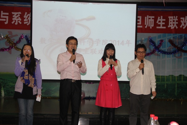钟声敲响,新春起航,2014年1月8日下午2:00数学与系统科学学院在思源楼二层多功能厅举行了元旦“数之爱”师生茶话会,在笑声与歌声汇成的海洋里,在这个温馨和喜庆的日子里,林群院士、离退休党委书记白曌宇、校工会常务副主席程文浩、经管学院韩立岩教授(华罗庚班导师)、保卫处副处长梁恩和,中法工程师学院党委副书记田原与数学学院全体领教职工、部分离退休教师、学生代表共庆2014年新年到来。学院院长郑志勇教授介绍了学院在2013年在学科建设、人才培养、师资队伍、合作与交流方面取得成绩,表示所有的这些成就都凝聚着全院教职工的心血和汗水,希望在崭新的一年里,学院上下继续坚持“以人为本,科学发展”的基本理念,团结努力,攻坚克难,使得学院各项工作进一步走上新台阶,切实实现学院又好又快地健康发展。最后,郑志勇院长对全院教职工表达了真诚的新年祝愿。