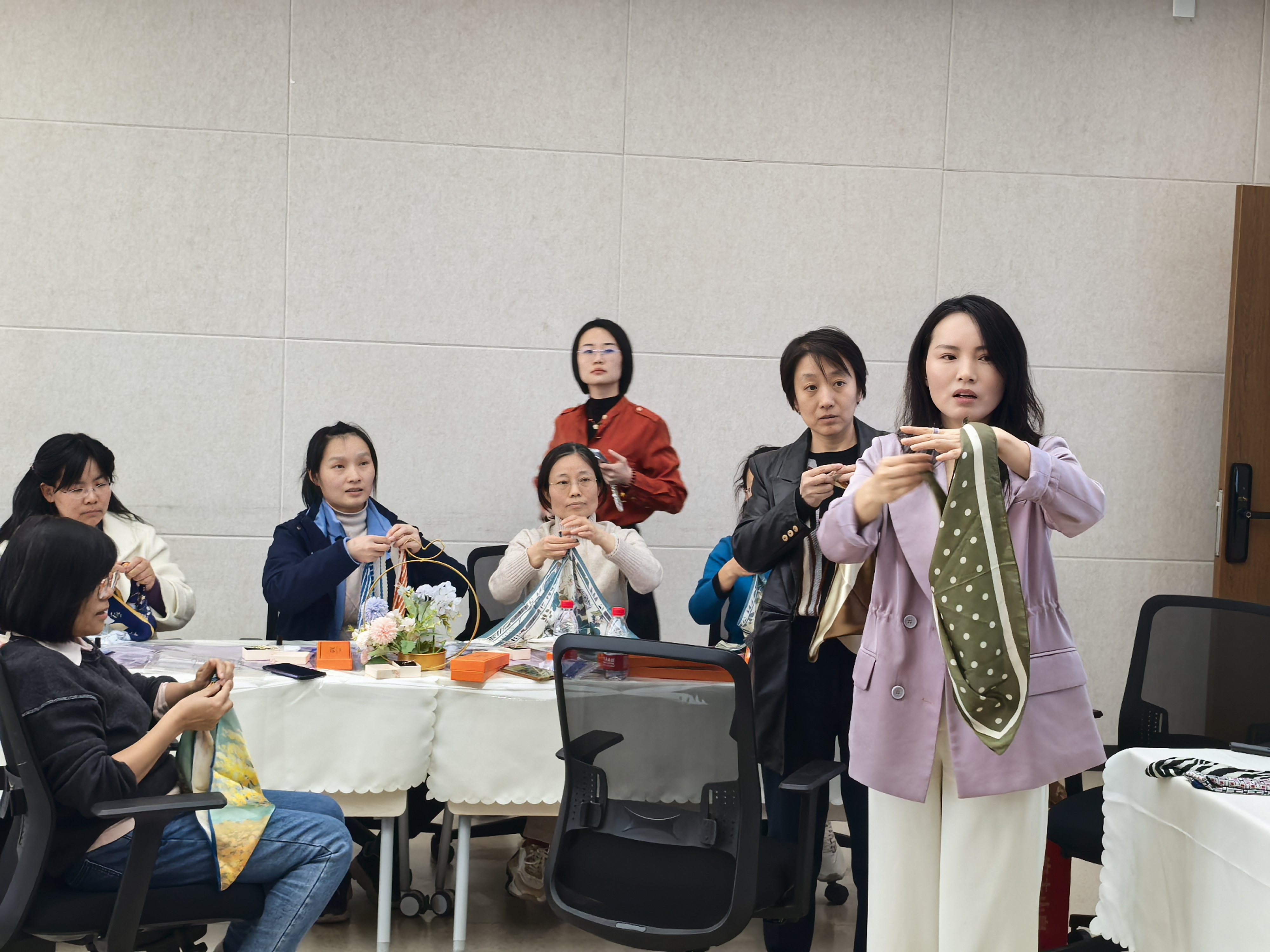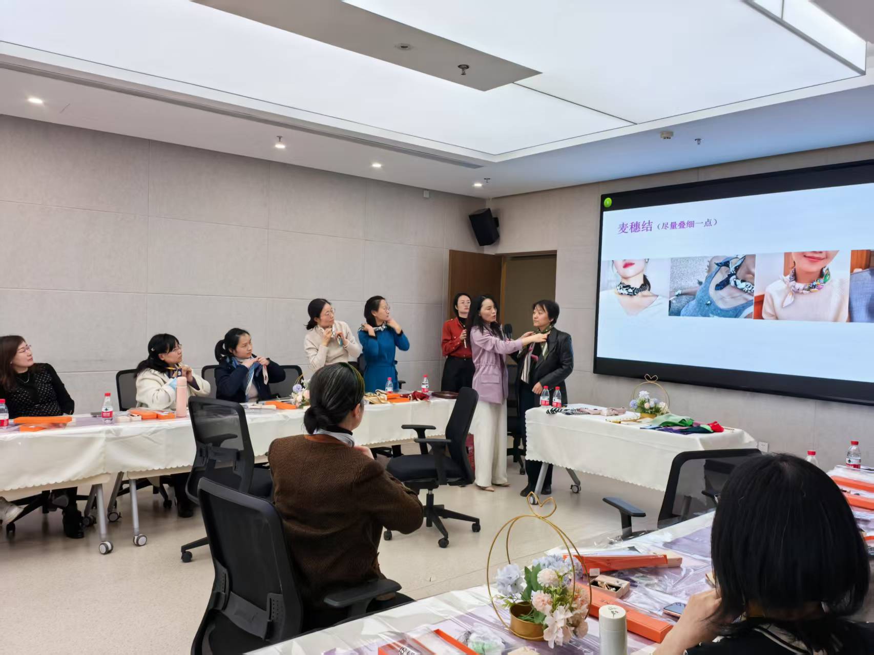 在活动中,特别邀请的高级形象设计师会允开展了“丝意人生,做“巾”致女人”的美学课堂,向教师们揭秘了如何用丝巾提升职业形象。她从光学三原色理论出发,详细讲解了冷暖色调与肤色、场合的搭配原则,并从花色与素色搭配、同色系搭配、撞色搭配、整体呼应搭配以及温柔与硬朗风格的搭配等多个角度,教授了丝巾的多种搭配技巧。同时,结合女性教师们常见的穿搭场景,以“物理人”所熟悉的几何线条为灵感,示范了如何通过折叠、缠绕等手法将丝巾变幻成颈间风景的多种百搭系法。教师们纷纷动手实践,平结、玫瑰结、麦穗结等造型在她们的巧手之下逐一呈现。“丝巾不仅是装饰品,更是展现个性的画布!”物理实验中心的王老师感慨道。在欢声笑语中,一贯严谨的“科研范”悄然绽放出柔和知性的光彩。