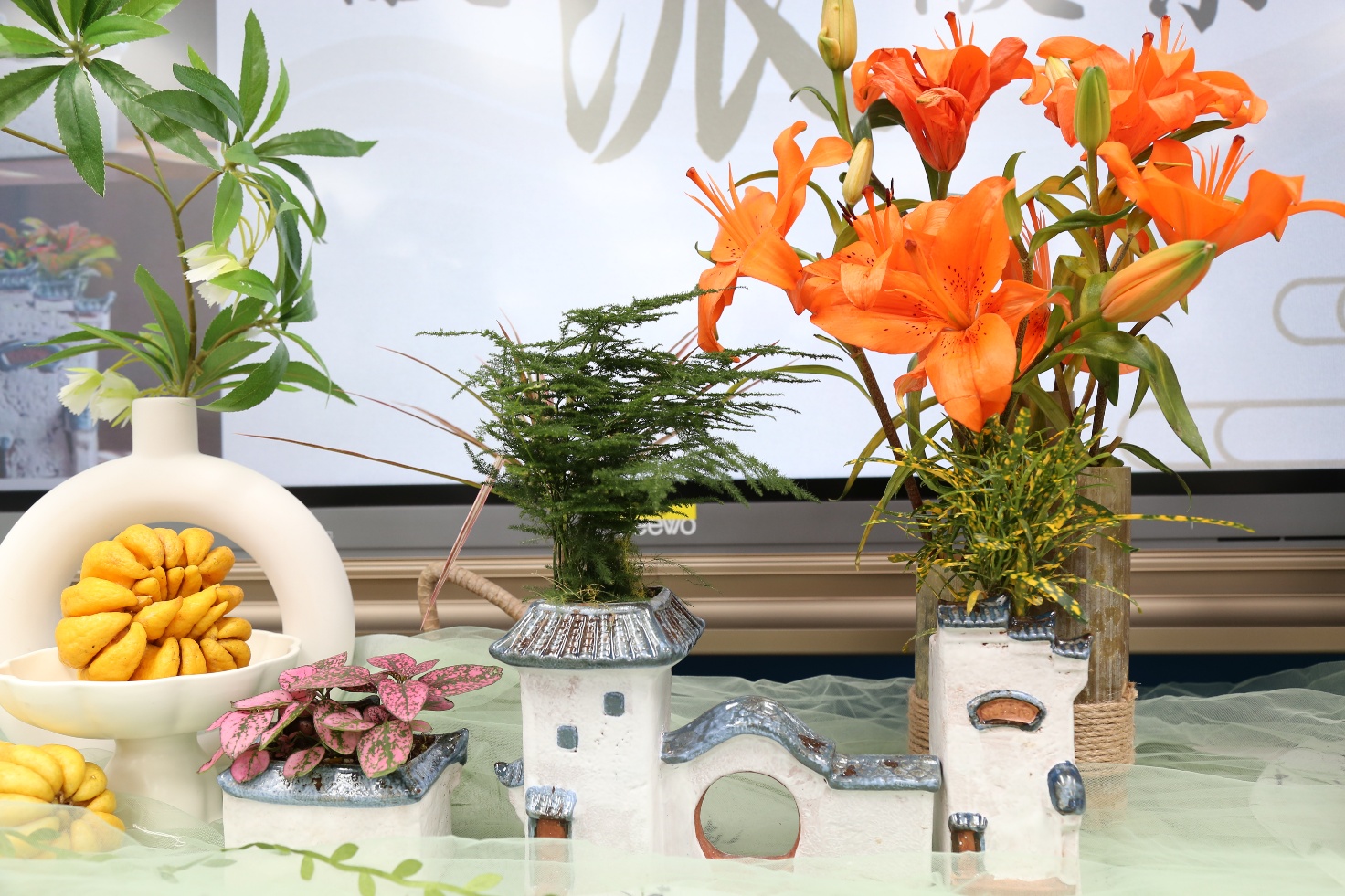 在老师们的热情参与下,活动正式开始。各位教职工挑选心仪的绿植和微缩景观材料,并结合徽派建筑元素,构思微景观布局。有的老师精雕细琢,讲究每一个细节的搭配;有的则大胆创意,将微景观塑造得层次分明、错落有致。大家一边探讨种植与设计心得,一边感受春天的生机与手作的乐趣,活动现场气氛融洽,欢声笑语不断。