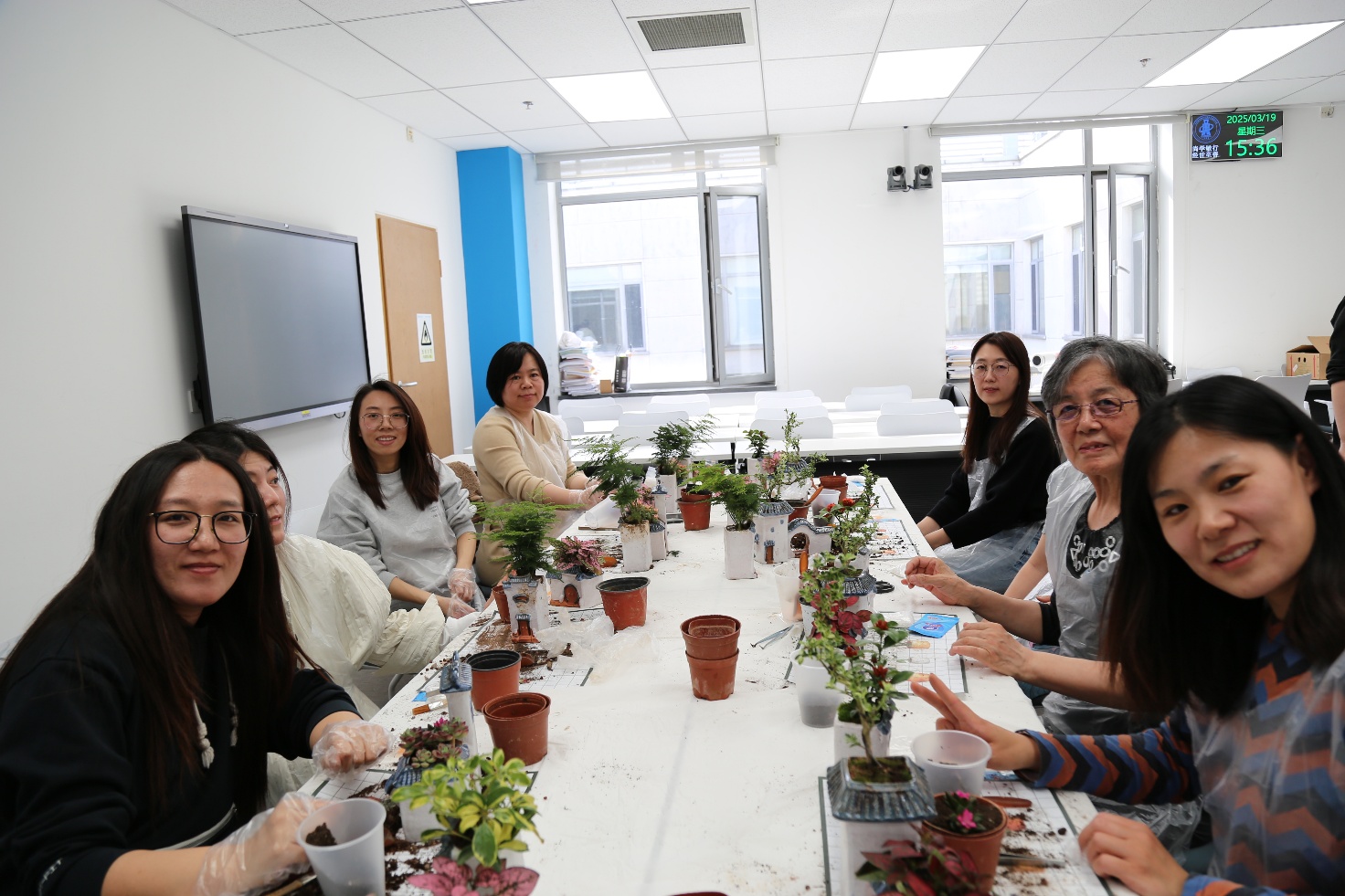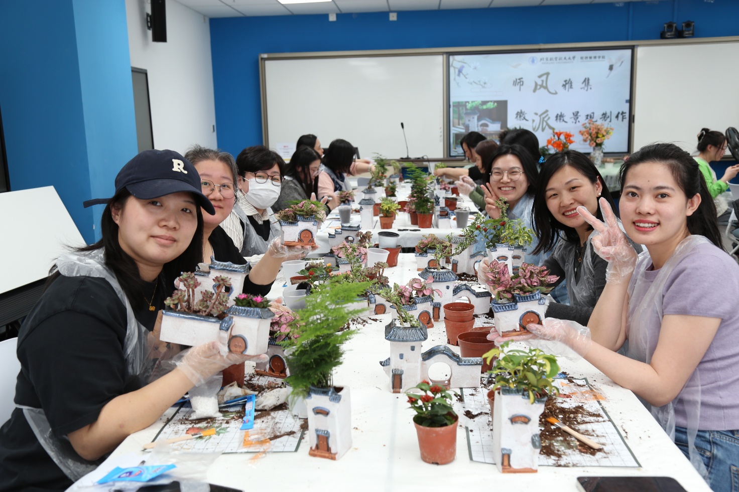 为丰富教职工的文化生活,缓解工作压力,倡导健康、快乐的工作理念,3月19日下午,经济管理学院工会在新主楼A1148成功举办了“师风雅集”主题活动——“绿动春光”徽派微景观手作体验活动。本次活动是“三八”妇女节系列活动之一,活动吸引了经管学院工会主席牟晖老师,副主席任晖老师和关工委副主任高志红老师在内的三十余位教职工积极参与,大家在轻松愉悦的氛围中,通过创意手作感受春日的勃勃生机。