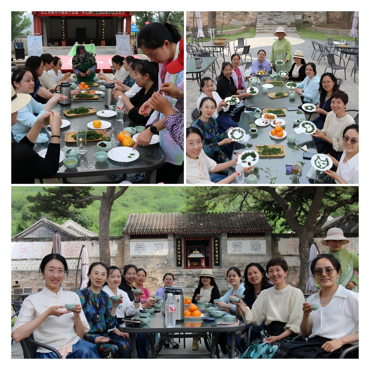 活动从学院老师们走进黄芩茶非遗工坊开始,北京灵之秀大村山茶种植专业合作社理事长张建民带领团队结合采茶小院的陈列,为大家介绍了古法制茶技艺。详细了解了开汤、冲泡、出汤等鉴茶步骤之后,老师们更加体会到小小杯中流转的不仅是茶叶,更是千年茶文化的积淀。在随后的登山采茶环节,张建民老师带领大家辨识黄芩、柴胡等中草药,科普茶文化与中医药的共生关系,老师们手持茶篮、头戴草帽,于簇簇黄芩间采下五月新绿的嫩芽儿,在实践中体悟茶文化的魅力。