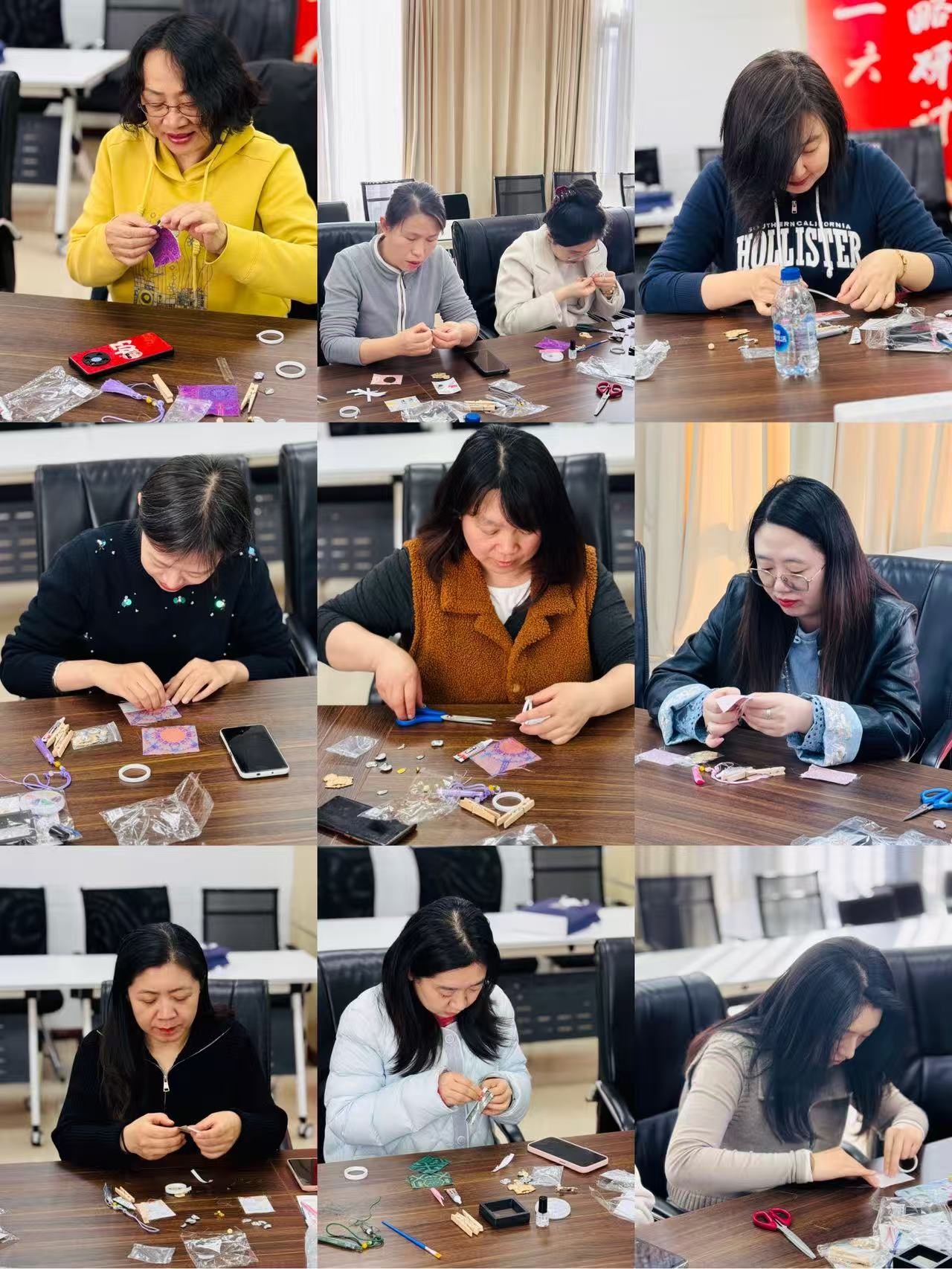 随后的手作环节,老师们从贴胶、裁剪到底胚缝合、串珠打结,一步步将零散的材料变成精美的宋锦小挂件。平日里敲击键盘、编写代码的双手,此刻在锦缎与珠饰间灵巧穿梭。大家一边制作一边交流心得,现场欢声笑语不断,暖意融融。